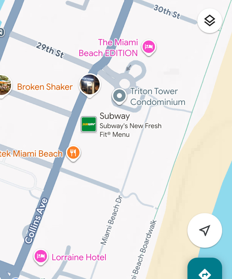 Instead, I visited a location just a few blocks outside of South Beach that I really liked – 29th street. Access to this cute chill spot is through a driveway in between a Condominium and Hotel. The beach curves outward/eastward a bit, which gives you nice views of the skyline in the distance. On days when the water is calm, it’s a nice spot to swim and clear your head. I particularly enjoy secluded places in metropolitan areas like this that are in walking distance of restaurants and public transportation.
